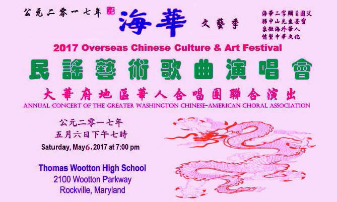 2017年5月6日,大華府音樂界最大盛宴-海華民謠藝術歌曲演唱會在維吉尼亞,華盛頓特區,馬裏蘭的歌唱愛好者們的期待和矚目中,於馬裏蘭州Thomas Wootton高中圓滿舉行。來自大華府地区的十八個合唱團体一一展示了各自的實力,為近600觀眾們獻上了一場展現合唱藝術的聽覺和視覺盛宴。